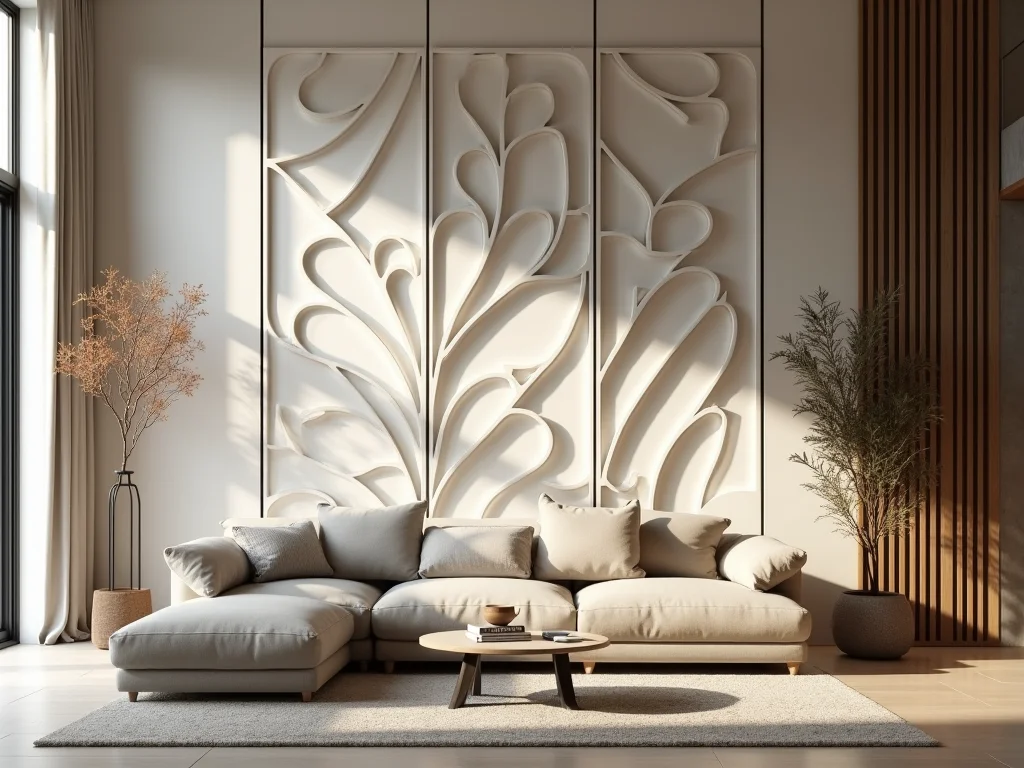 Biombo decorativo com painéis de MDF vazado em formato de folhas, pintado em branco, adicionando um elemento escultural a uma sala de estar minimalista.