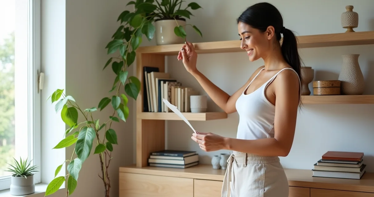 Olha só: pegue livros com capas neutras, vire as lombadas para dentro e use como base. Com R$ 50, compre uma planta pendente como hera (custa em média R$ 25) e um vaso de cerâmica artesanal simples (por volta de R$ 30). O resto vem da recomposição de porta-retratos, lembranças de viagem e até de uma tigela da cozinha bem posicionada.