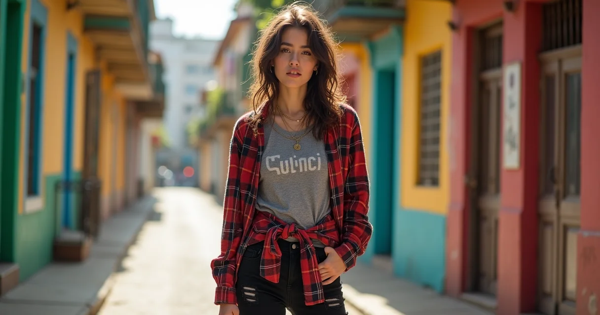 - A regra das três camadas: Nunca pare na segunda. A base (camiseta de banda) + a intermediária (camisa de flanela amarrada na cintura ou nos ombros) + a de acabamento (jaqueta de couro falsificado ou cardigã oversized).