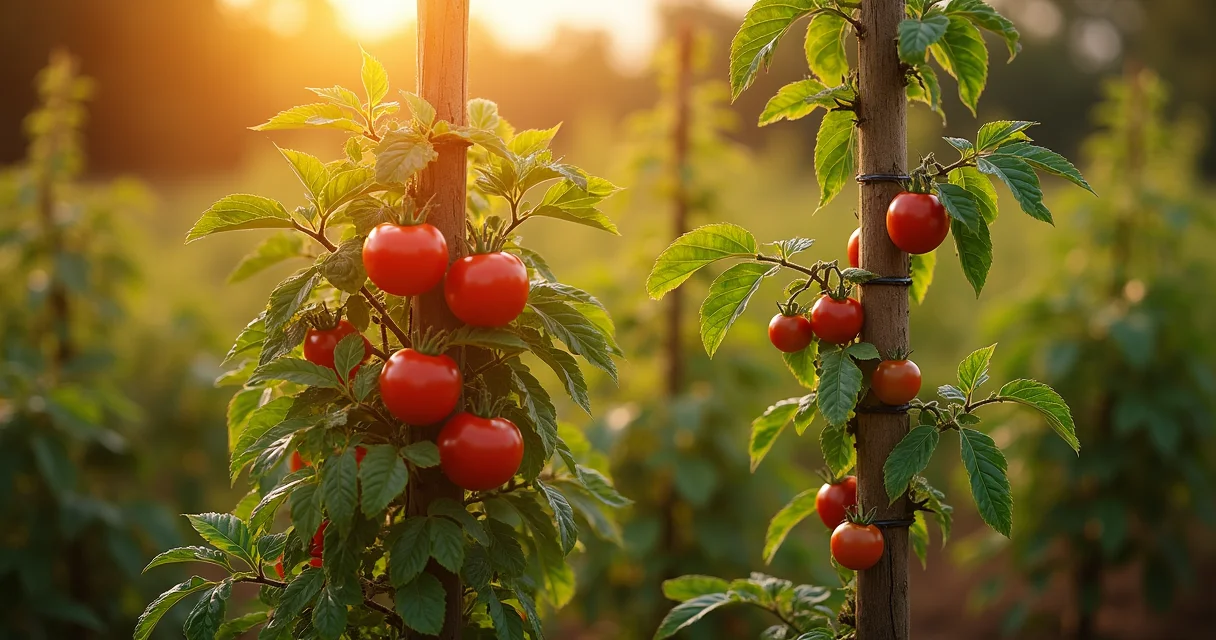 Olha só o detalhe: no calor brasileiro, o indeterminado precisa de tutoramento firme com bambu ou arame galvanizado. O determinado aguenta melhor sozinho.